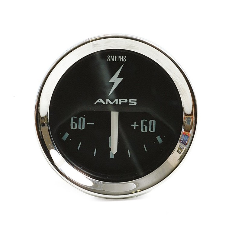 Genuine SMITHS designed instrument, skillfully crafted to the original drawings and specifications, using the original tools and dies. This one is 52 mm diameter with 1/2V chrome bezel, and white figures on a black quadrant dial, reading from -60 to +60 amps. Supplied with bulb holder and bulb, together with the necessary mounting clamp.