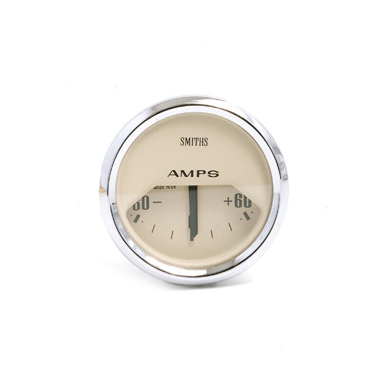 Genuine SMITHS designed instrument, skillfully crafted to the original drawings and specifications, using the original tools and dies. This one is 52 mm diameter with Full V chrome bezel, and black figures on a magnolia quadrant dial, reading from -60 to +60 amps. Supplied with bulb holder and bulb, together with the necessary mounting clamp.