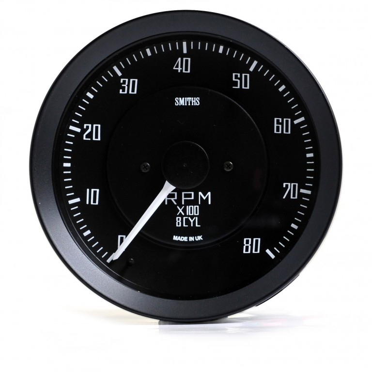 Genuine SMITHS designed instrument, skillfully crafted to the original drawings and specifications for the GT40, using original tools and dies. 100mm diameter with white figures on a black dial reading from 0 to 8000 rpm. and switchable for 2, 4, 6, 8 and 12 cylinder engines, including 'wasted spark' 2 cylinder engines, for example Citroen 2CV. 12 volt (NEGATIVE EARTH ONLY) electronic operation Supplied with bulb holder and bulb, together with the necessary mounting clamps. Full instructions for setup are included