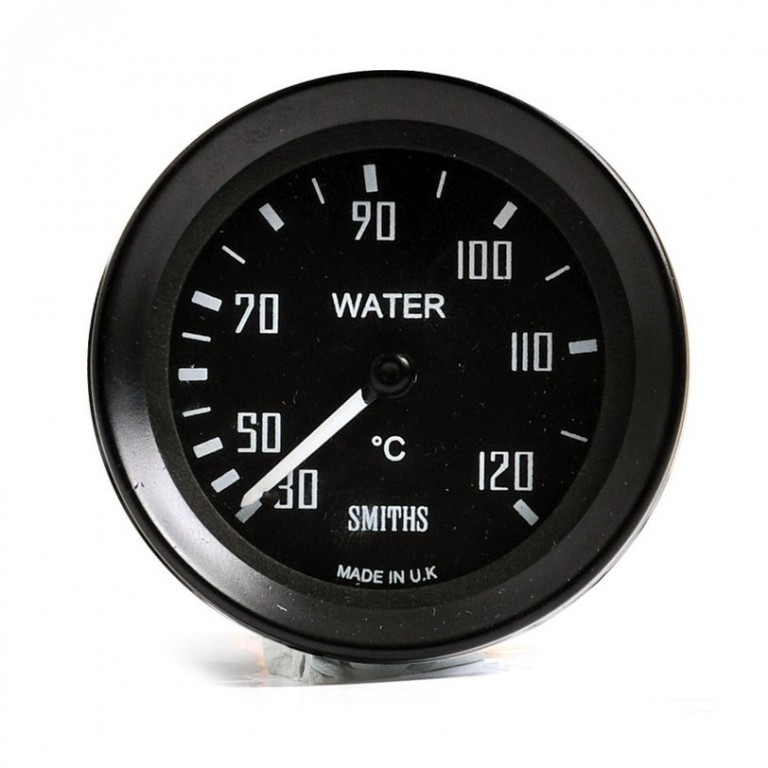 Genuine SMITHS designed instrument, skillfully crafted to the original drawings and specifications for the GT40, using original tools and dies. 52mm diameter with white figures on a black dial reading from 30 to 120 degrees C full scale. Mechanical operation, with 3048 mm (120 in) long capillary with 5/8 UNF male thread adaptor to screw into the block. Other adaptors are available if required. Supplied with bulb, bulb holder and mounting clamp