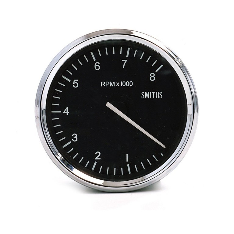 Smiths Classic Motorsport 100 mm diameter tachometer, with full V chrome rim and white figures on a black dial reading from 0 to 8,000 rpm. The unit is switchable for 2, 4, 6, 8 and 12 cylinder engines, including 'wasted spark' 2 cylinder engines, for example Citroen 2CV. 12 volt (NEGATIVE EARTH ONLY) electronic operation with 12 volt illumination.