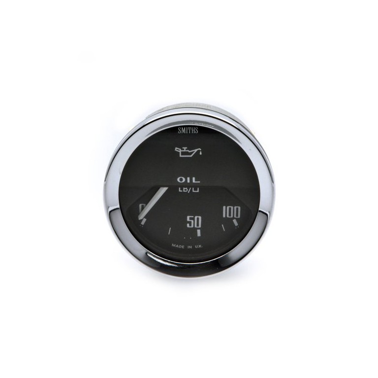 Genuine SMITHS designed instrument, skillfully crafted to the original drawings and specifications, using the original tools and dies. This one is 52 mm diameter with 1/2V chrome bezel, white figures on a black quadrant dial reading from 0 to 100 lbs per square inch. Supplied with bulb holder and bulb, together with the necessary mounting clamp. A corresponding oil pressure sender will be required for this gauge if one is not currently fitted to your vehicle.