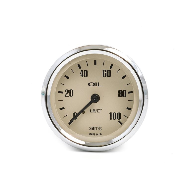 Genuine SMITHS designed instrument, skillfully crafted to the original drawings and specifications, using the original tools and dies. This one is 52 mm diameter with full V chrome bezel, black figures on a magnolia full scale dial reading from 0 to 100 lbs per square inch. Supplied with bulb holder and bulb, together with the necessary mounting clamp. You will require an oil pressure pipe, an adaptor and maybe a T piece to connect to your engine, unless you already have these in the vehicle.