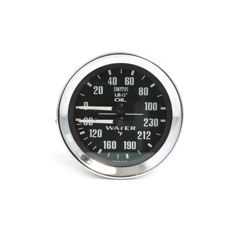 Genuine SMITHS designed instrument, skillfully crafted to the original drawings and specifications, using the original tools and dies. This one is 52mm diameter with 1/2V chrome bezel with white figures on a black dial. Oil pressure from 0 to 100 lbs per square inch and water temperature from 90 to 230 degrees F. 1980 mm capillary fitted as standard. Water temperature bulb is 5/8 UNF male. A suitable pressure pipe and fittings for oil pressure will need to be purchased separately if required. Supplied with bulb holder and bulb, together with the necessary mounting clamp.