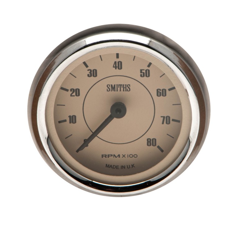 Genuine SMITHS designed instrument, skillfully crafted to the original drawings and specifications, using the original tools and dies. Designed as an extension to the 52mm range, this one is 52 mm diameter with Full V chrome bezel, black figures on a magnolia dial reading from 0 to 8000 rpm. Supplied with bulb holder and bulb, together with the necessary mounting clamp. A black version is also available