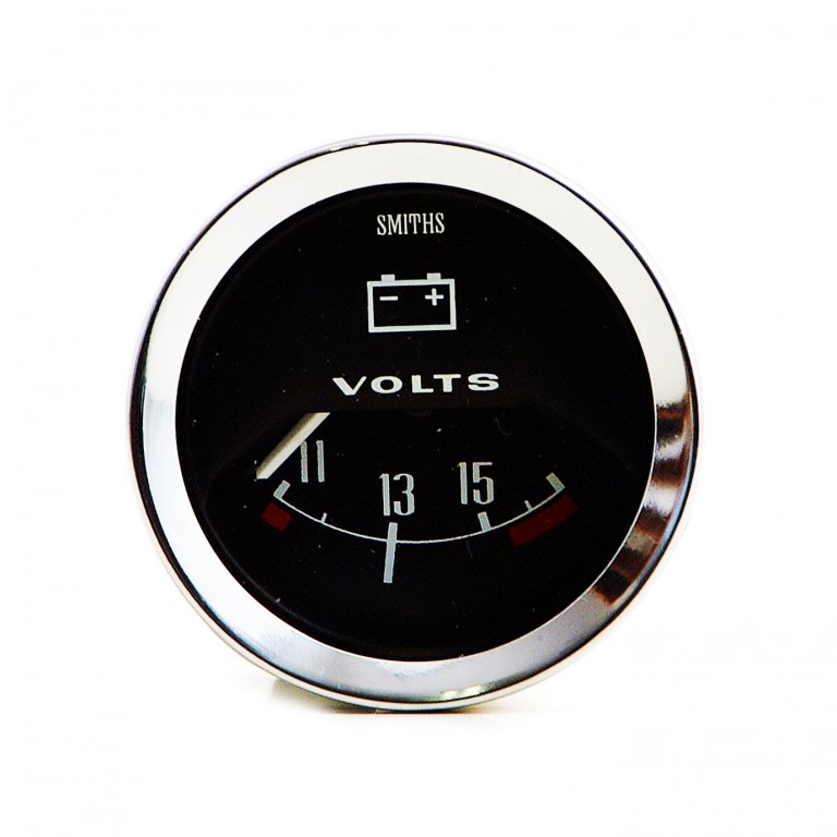 Genuine SMITHS designed instrument, skillfully crafted to the original drawings and specifications, using the original tools and dies. This one is 52 mm diameter with 1/2V chrome bezel, white figures on a black quadrant dial reading from 11 to 15 volts. Supplied with bulb holder and bulb, together with the necessary mounting clamp.