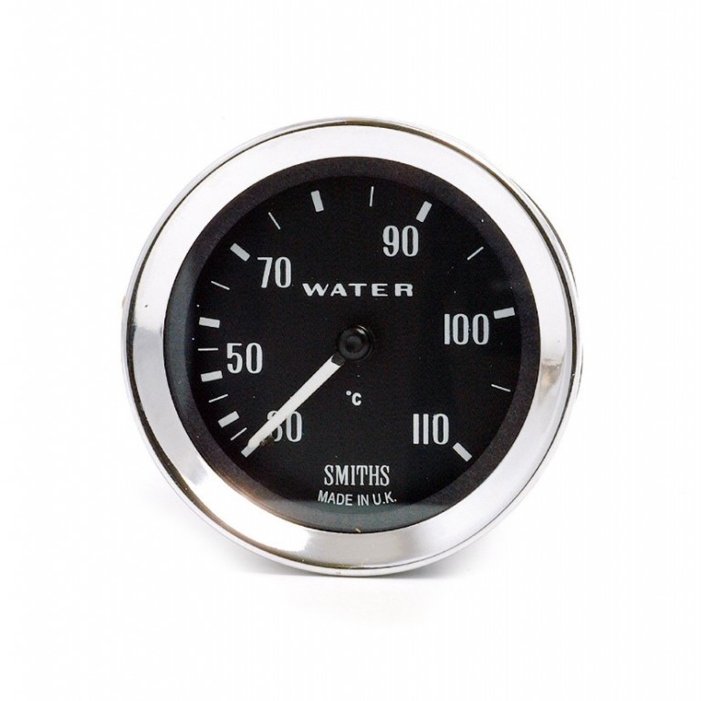 Genuine SMITHS designed instrument, skillfully crafted to the original drawings and specifications, using the original tools and dies. This one is 52 mm diameter with 1/2V chrome bezel, white figures on a black full scale dial reading from 30 to 110 degrees C. Supplied with bulb holder and bulb, together with the necessary mounting clamp, and a 1980 mm long capillary with 3/8 BSP threaded nut. Also included is a 3/8 BSP to 5/8 UNF Male/Male adaptor. Other adaptors are available to order separately.