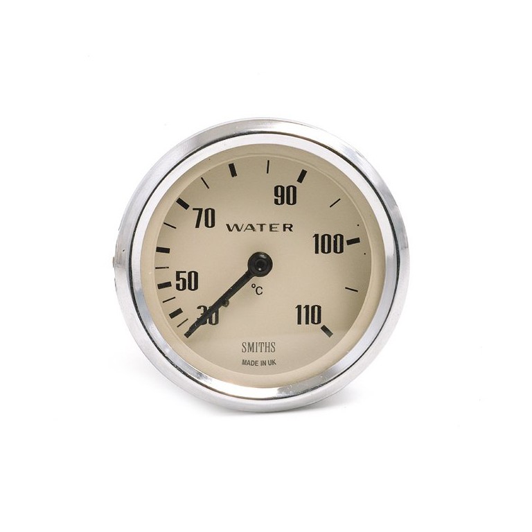 Genuine SMITHS designed instrument, skillfully crafted to the original drawings and specifications, using the original tools and dies. This one is 52mm diameter with full V chrome bezel, black figures on a magnolia full scale dial reading from 30 to 110 degrees C. Supplied with bulb holder and bulb, together with the necessary mounting clamp, and a 1980 mm long capillary with 3/8 BSP threaded nut. Also included is a 3/8 BSP to 5/8 UNF Male/Male adaptor. Other adaptors are available to order separately.