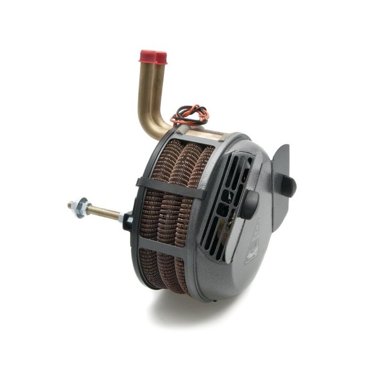 A reproduced version of the Smiths Circular heater found in virtually every British car of the 1950's and 60's. This version has 90 degree angled water inlet pipes for 5/8 inch water hose and no demister facility. 12 volt operation. Single speed. Heat output of approx 2kw. You can reassemble it with the pipes at the top or bottom. Two doors control heat into the car. Finished in period looking grey hammered enamel. Overall diameter 210 mm. This is probably the easiest type of heater to fit if your car never had a heater. Ideal for kit cars. A version with demister facility is also available