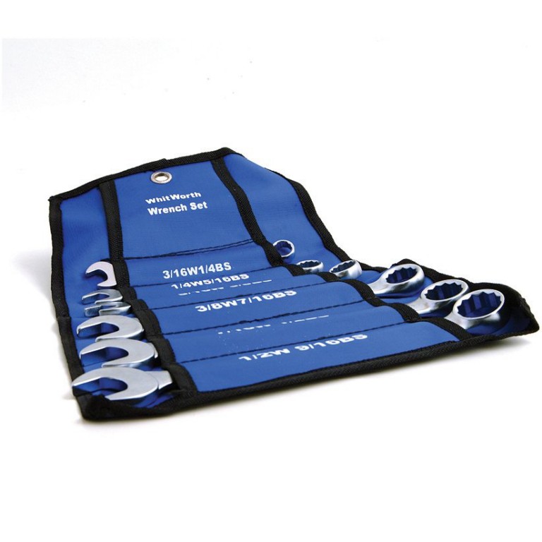 Set of six chrome vanadium Spanners, one end a ring spanner and the other open ended. Whitworth sizes 3/16', 1/4', 5/16', 3/8', 7/16' and 1/2'. These also fit BSF, one size up 1/4', 5/16', 3/8', 7/16', 1/2' and 9/16'. Spanner sizes refer to the thread size and NOT the head size. Comes in a useful tool roll. These sizes were used on most British cars up to about 1955