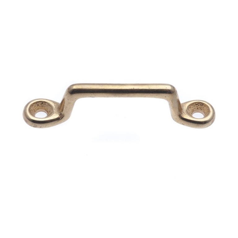 Brass staple, fit to bonnet strap by folding the strap back and riveting or similar. For this we offer screws, refer to 097.761, or rivets, refer to 097.766. The staple is then fitted to the chassis or similar. Overall width 68mm. Can also be used to secure luggage straps