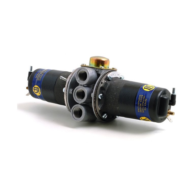 SU Dual or double-ended fuel pump, Ref AZX1501. Similar in performance to the AZX1400 series of pumps, this pump is designed to operate as two separate units for those systems having twin fuel tanks, or a main and reserve supply. Two inlet ports on the pump body are for connection to the two fuel tanks. Both sides of the pump discharge into the single outlet provided. Electrical control should be via a changeover switch. This pump is designed to be mounted in a clamp, and as such, as no threaded bosses for bolt fixing. Supplied without unions as shown. These are available to purchase separately should there be a requirement. A solid state NEGATIVE earth electronic version is also available.