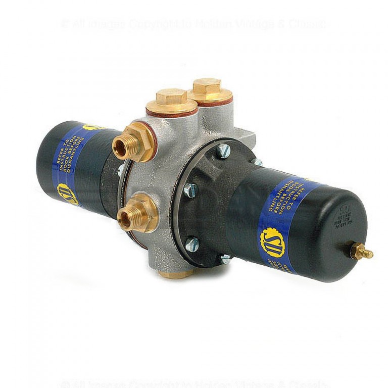 Double ended or dual SU Fuel Pump, original reference AUA 11, This version is fitted with solid state electronics and is suitable for NEGATIVE earth applications only.. It is a low pressure pump with minimum flow of 20 gallons per hour, with both ends working together. Needs to be mounted at the front of the vehicle to ''pull'' the fuel through. Flat top end cap. Corresponding positive earth version is available, as is a 12 volt points version. Pipe connections are via 1/4 BSP fittings, a selection of which is available separately. A 6 Volt version of this pump is also available