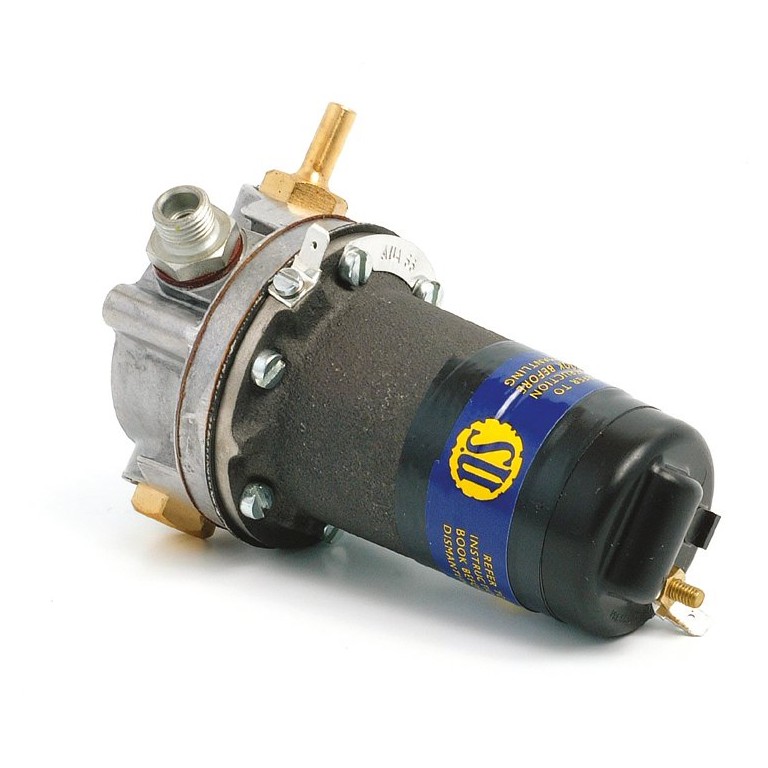 Solid State Electronic Type without points. 12 volts. POSITIVE EARTH. 12 volts. 8 gallons per hour at 1.5 p.s.i. Ref AUA66. As fitted to Morris Minor 1000 and many others, Should be fitted near engine, Supplied with one screw on and one push on Union as shown. Rear mounted via 2x 1/4 BSF bolts (not supplied). There is a wide range of pipe fittings and unions available.