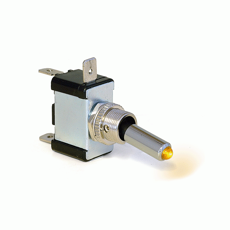 A panel mounted Toggle Switch providing Off-on function, which requires a 12mm diameter hole. When switched on the tip is illuminated by an amber LED. LEDs give a stable light and do not generate heat. Connections at the rear are by Lucar connectors. This switch is of a durable construction with nickel plated lever and is rated at 20 amps on 12 volt systems. Wiring instructions are on the side of the Switch. This switch can be enhanced by using our Bezel or Nut, in combination with the Threaded Washer if replacing an original Lucas switch