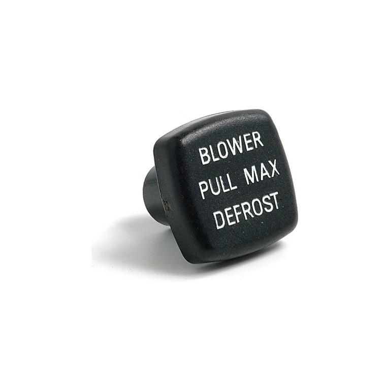 Square Black Knob, Lettered BLOWER / DEFROST as shown. As fitted to the TR6. This knob is designed to fit to a cable or switch with a hexagonal shaft We keep a range of knobs of the type fitted to the TR6, available both individually, or as a set.