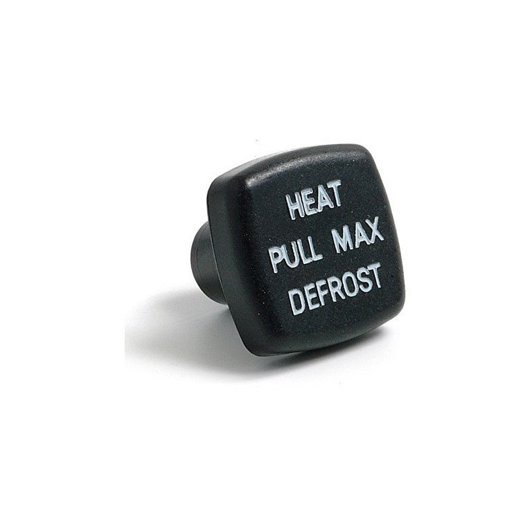 Square Black Knob, Lettered HEAT / DEFROST as shown. As fitted to the TR6. This knob is designed to fit to a cable or switch with a hexagonal shaft We keep a range of knobs of the type fitted to the TR6, available both individually, or as a set.