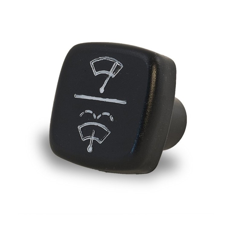 Square Black Knob, with a Wiper / Washer symbol as shown. As fitted to the TR6 European Spec from CR1 on and USA from CF1 on.. This knob is designed to fit to a switch with a hexagonal shaft. We keep a range of knobs of the type fitted to the TR6, available both individually, or as a set
