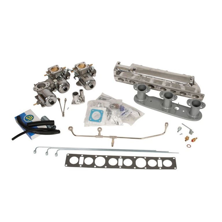 Triple SU Carburettor Conversion Kit - converting from twin 175CD Stromberg units. Includes inlet manifold, linkage, gaskets, carburettor trumpet for air intake, fuel rail and overflow pipes.
