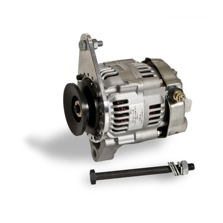 If you would like to replace your existing dynamo or alternator with a lightweight alternator weighing only 2.8 kilos with a power rating of 45 amps, but are concerned that you may not be able to fit it to your particular vehicle then this is the one for you. Uniquely it has a multi-drilled fixing plate which allows you to manoeuvre the unit into any position on the block giving total flexibility in fitting. Diameter of alternator body is approximately 120mm and the length also 120mm. Supplied with a standard V pulley fitted and instructions