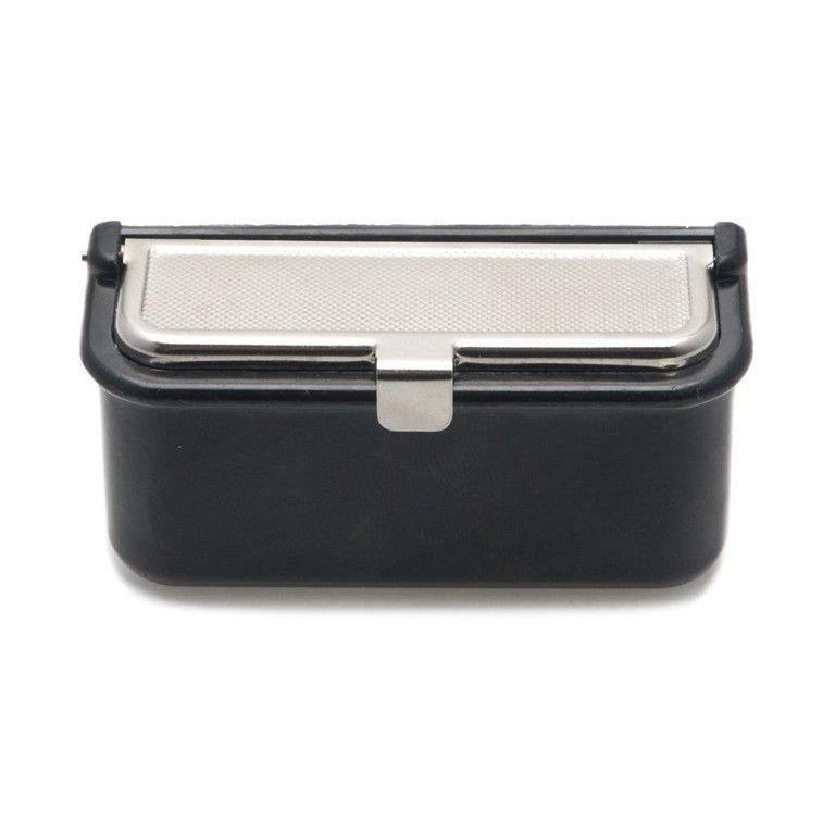 Hinged lid, length 85mm, width 30mm and depth 35 to 40mm. Can be fitted into a suitably shaped hole, fitted from the back with two screws or hung onto a simple clip (not supplied). Removes completely for emptying