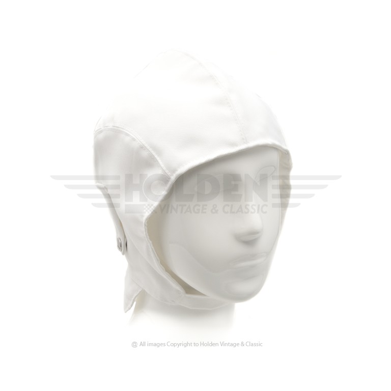 A lightweight white cotton Summer cloth flying helmet with neck cover and goggle straps.